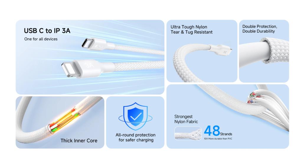 Este cable de carga Lightning ofrece una carga rápida y segura de 3 A para iPhone y otros dispositivos compatibles con Lightning.