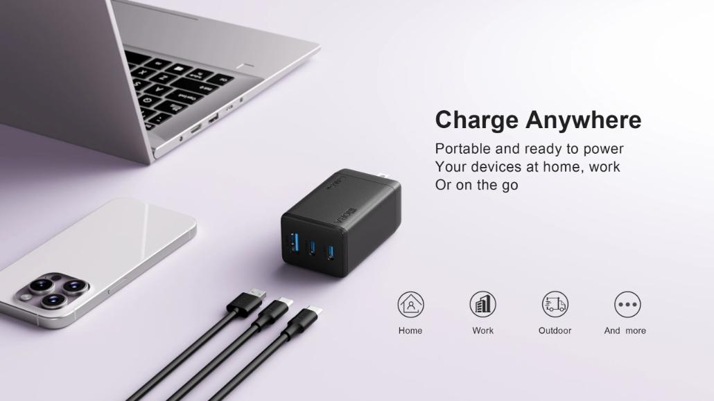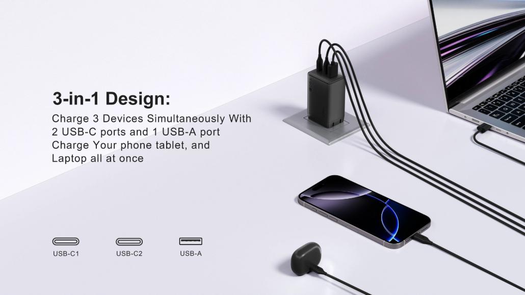 Cargue hasta 3 dispositivos simultáneamente con este cargador compacto GaN de 65 W, con dos puertos USB-C y un puerto USB-A, carga rápida USB-C PD 3.1/PPS y amplia compatibilidad con teléfonos, tabletas, computadoras portátiles y más: perfecto para viajes o uso doméstico.