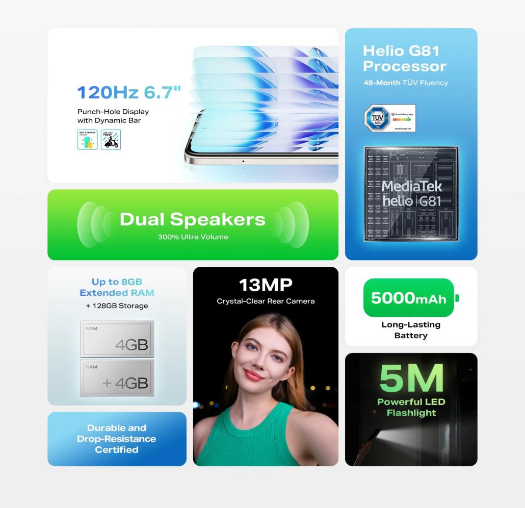 Rendimiento: Equipado con el procesador MediaTek Helio G81 de ocho núcleos, acompañado de opciones de 3GB de RAM (expandible mediante software) y hasta 128GB de almacenamiento.